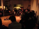 Wenn ich eine „Szene“ beschreibe, die mir noch vom Hafen im Allerweltshaus im Kopf ist, zeigt sich dadran vielleicht am ehesten, wie der erste Teil des Abends war. Folgende Szene: Beim Thema „Ich, der Clown“ von Svenja und Elise gab es die Aufgabe an uns angehende Clowns ein Gefühl in zunehmender Intensität darzustellen. Daraus enstand, dass eine Person in unserer Runde eine Säule im Saal gekonnt hochkletterte sich zitternd daran festhielt und schrie. Angst war das Gefühl und ich würde sagen es war gekonnt dargestellt. Für den ersten Teil dominierte also Lachen die Atmosphäre. Schön, dass sich so viele darauf einlassen konnten, sich vor z.T. Fremden zum Clown zu machen.